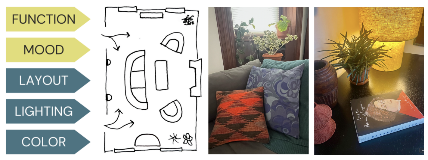 First, determine FUNCTION: what do you do in the room? What is the traffic flow? The storage needs? Write down everyone that uses it, and what is needed for it to function well.